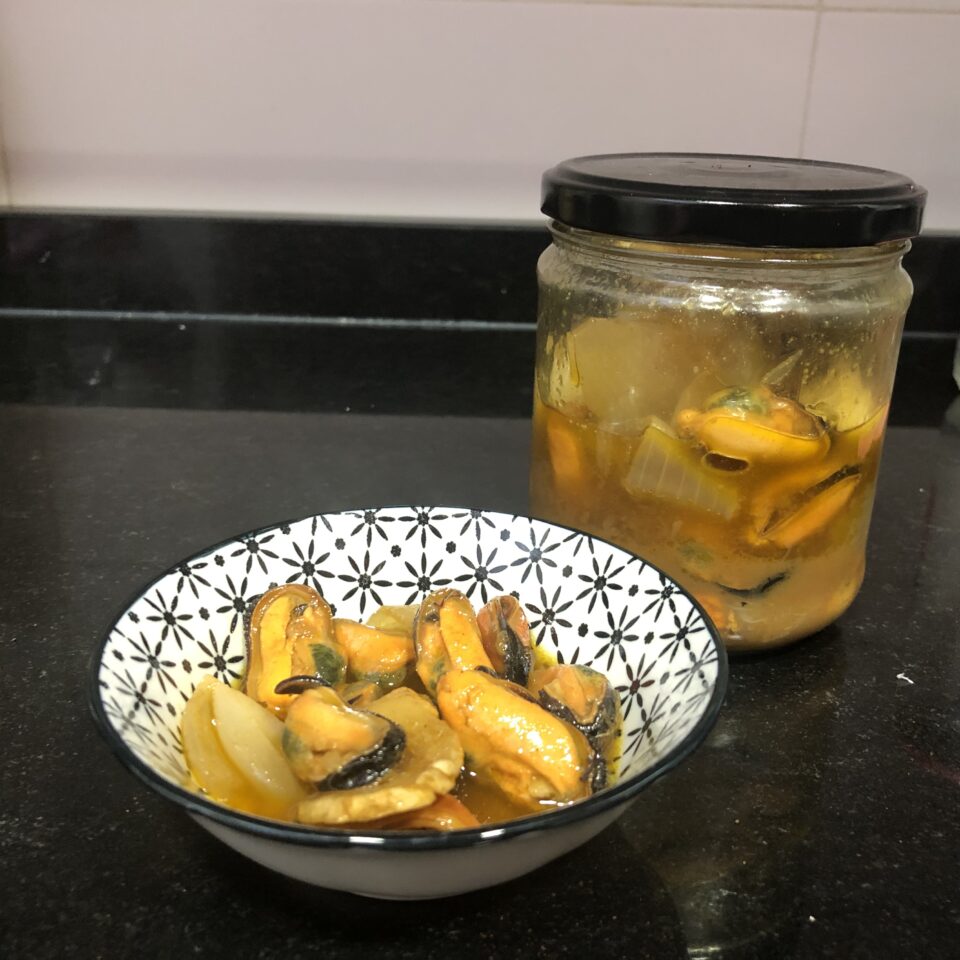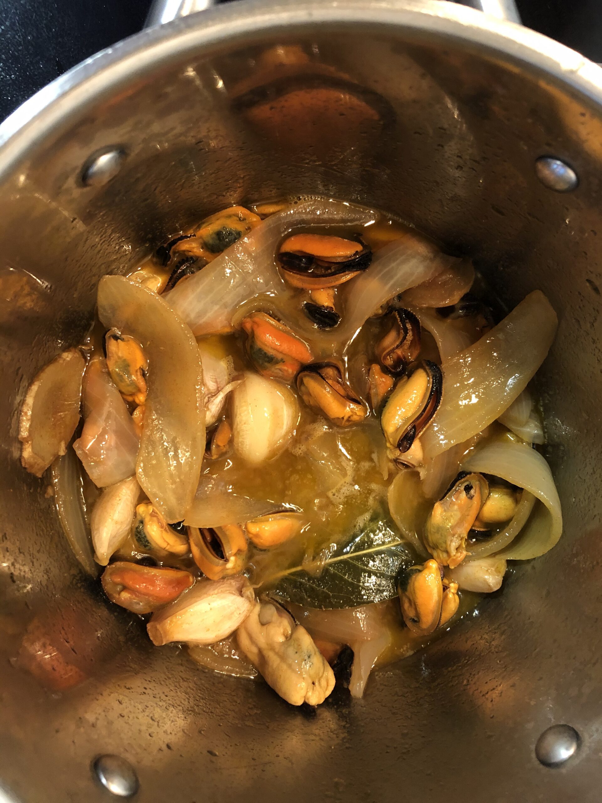 Volvemos a poner al fuego para darle un calentón a los mejillones durante unos segundos.