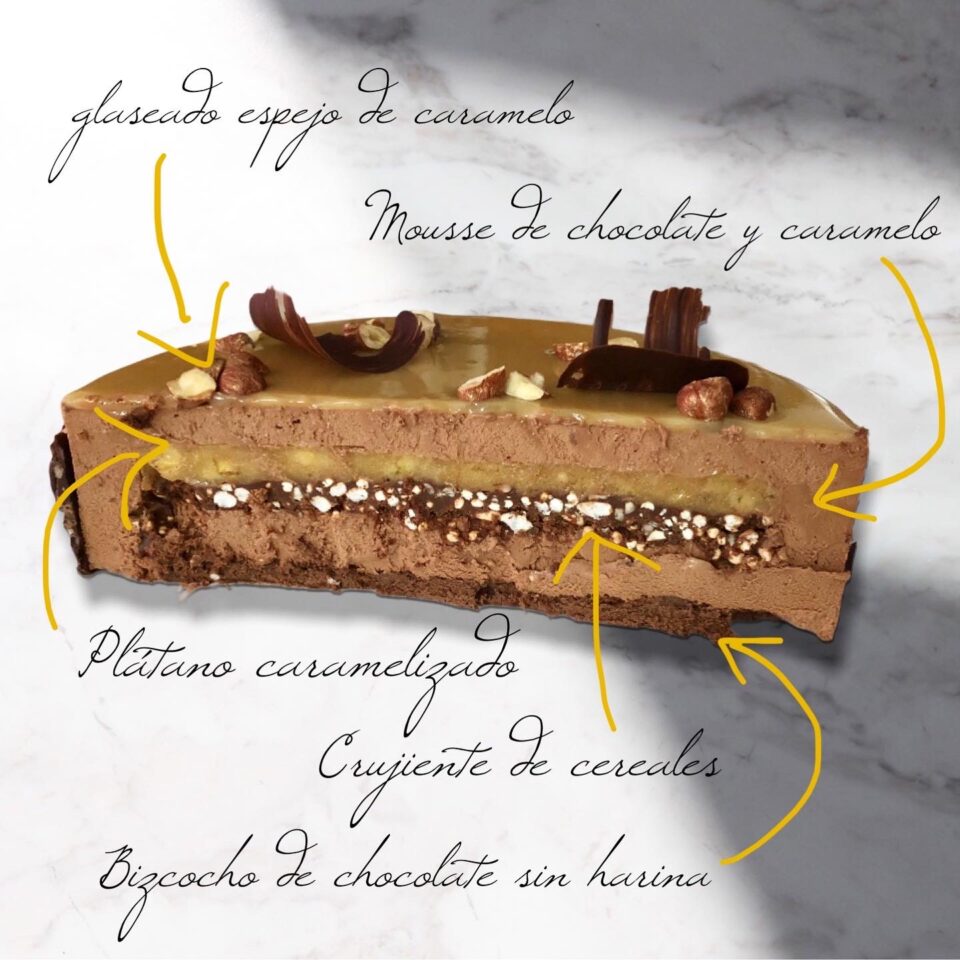 Tarta de chocolate y caramelo con plátano y crujiente de cereales