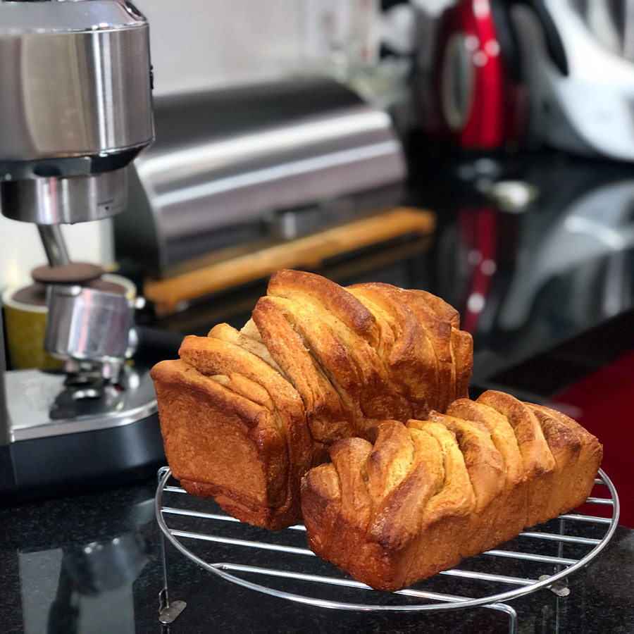 Un día me levanté, vi esta hermosura de pan dulce tipo brioche en el Instagram de Claudia&Julia y supe que tenía que hacerlo. En mi caso hice dos panes, uno mediano y otro pequeño para regalar. Me gustó mucho la textura aunque creo que tendría que haber sido más paciente con el primer levado de la masa para que creciera más y fuera más esponjoso. A mis catadores les gustó, yo tendré que repetirlo para degustarlo bien cuando mi cerebro decida volver a percibir el aroma y sabor de la canela tras haber superado totalmente las secuelas de la maldita COVID-19.