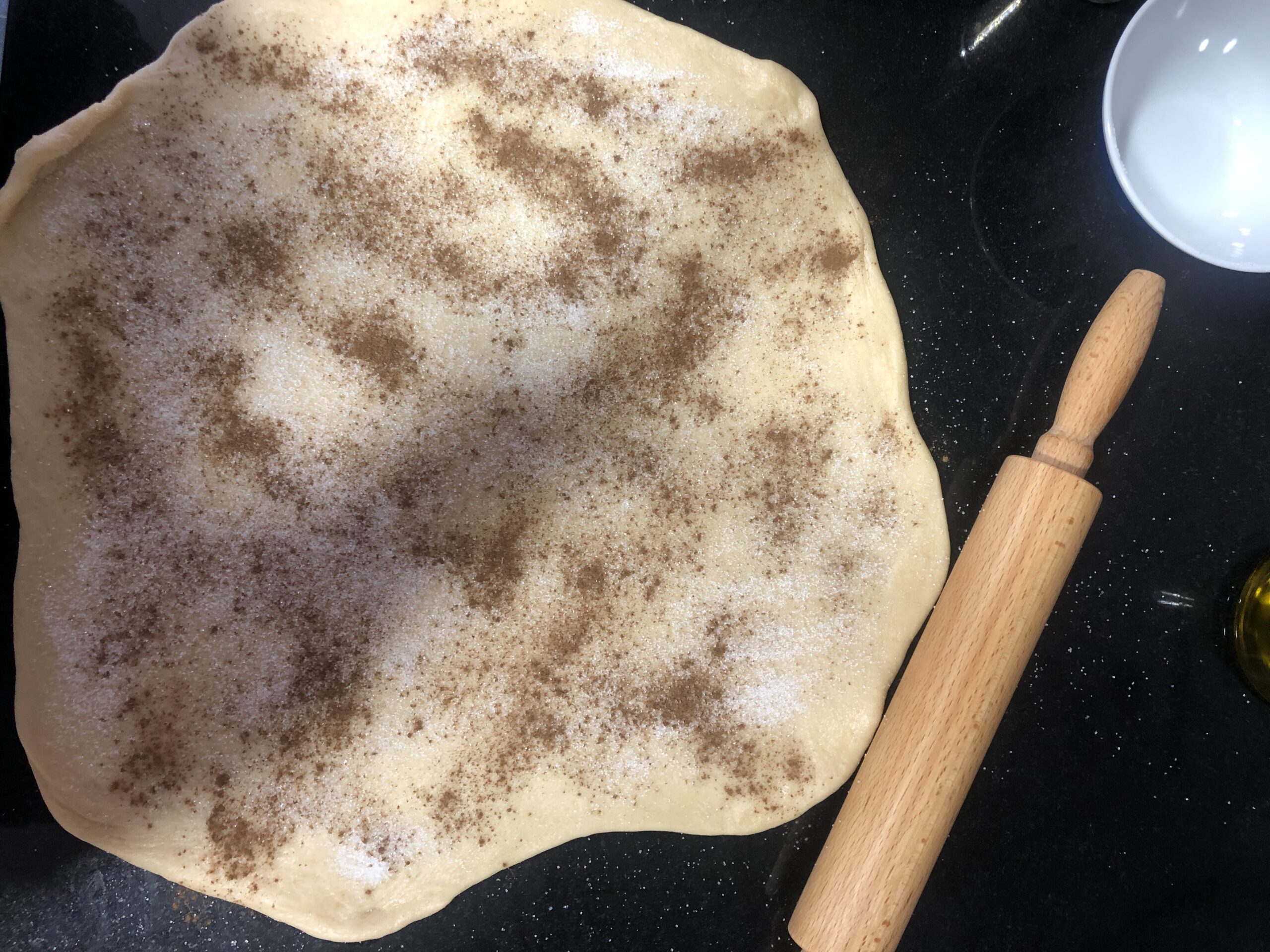 Espolvoreamos con el resto del azúcar y la canela molida y aplastamos con las manos o con el rodillo para que se incruste bien.