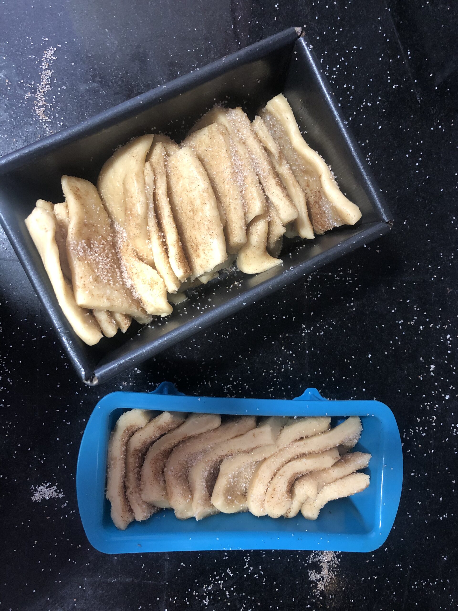 Colocamos los cuadrados de masa en el interior del molde previamente engrasado, en vertical. El azúcar y canela que te quede en la encimera porque se haya caído de la masa al colocarla, puedes echarla por encima del pan.