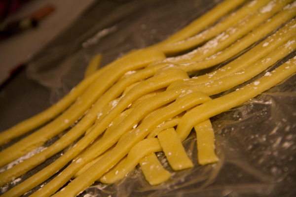 Procedemos a trenzar la masa. Para ello, pondremos la mitad de las tiras juntas en posición vertical. Luego iremos colocando una a una las otras tiras en horizontal haciéndolas pasar por las tiras verticales alternando arriba y abajo (como una imagen vale más que mil palabras, echadle un vistazo a la foto).