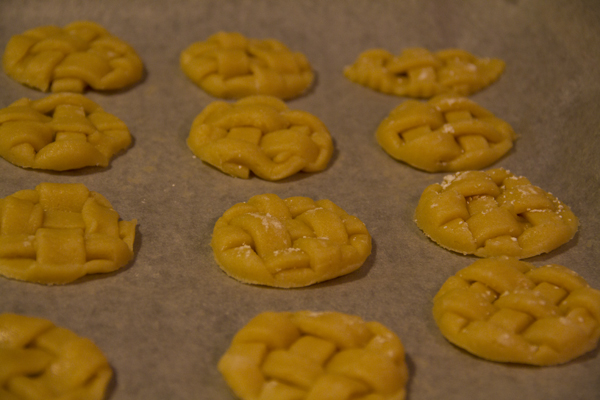 Con un cortapastas redondo (o de la forma deseada) vamos cortando las galletas de nuestra masa recién trenzada.
