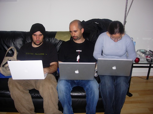 Con Juanjo y Rocío rodeados de mac, el que esta sobre mi era mi nuevo macbook.
