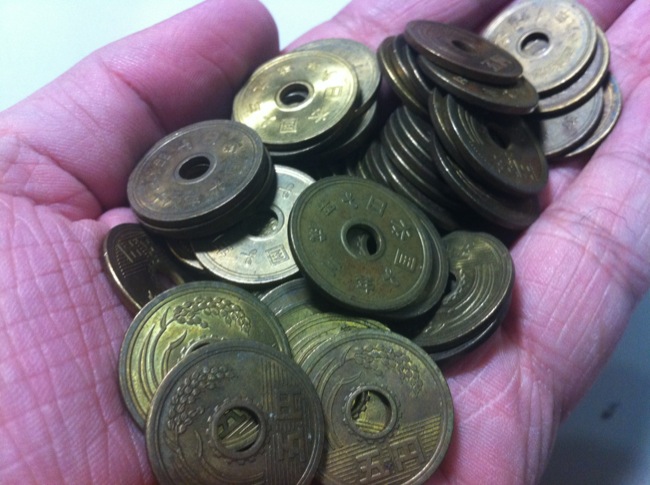 Conte el dinero de mi hucha mientras aprovechaba para sacar los euros que tenia, esas eran las monedas de 5 yenes.
