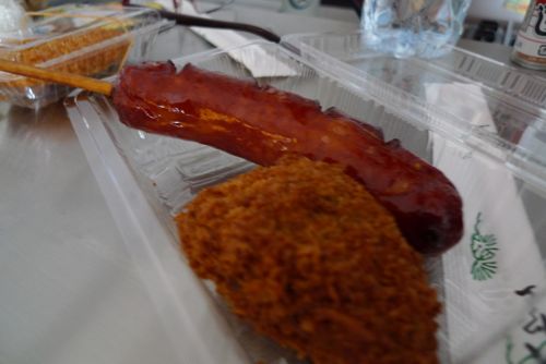Tambien tienen algo de okazu que es la parte del obento sin el arroz, que digamos que es la guarnición. Aquí es mas reguleras, los oniguiris (bolas de arroz) son enormes pero con muy poco relleno, las croquetas de patata son muy normalitas, en plan supermercado y la salchicha un poco artificial, de todos modos conservando siempre precios geniales.