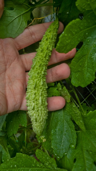 Encabezando el post véis la foto de uno de los frutos de goya. La planta da muchísimos y aunque crecían notamos que llegados a cierto punto no crecían más. Así que pensamos que quizá teníamos demasiados. Por lo que empezamos a arrancar los pequeños y nos centramos en 5 que estában algo más grandotes.