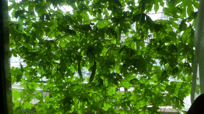 Si recordáis hace algún tiempo estuve hablando de la cortina verde. Que era una ingeniosa forma que los japoneses tenían de hacer descender unos grados la temperatura de sus casas a la vez que conseguían un bonito efecto estético. Nosotros en casa también decidimos llevar a cabo esta práctica. Práctica que además tiene una ventaja adicional y es que la planta que se usa para cubrir de verde las ventanas no solo tiene la propiedad de ser una gran trepadora y de crecer a una velocidad increíble si no que además produce un fruto que es comestible.